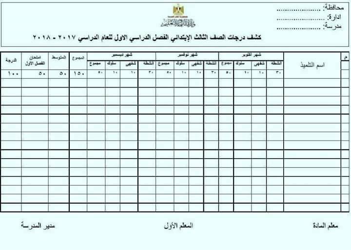 كشوف توزيع درجات الفصل الدراسي الاول بعد الغاء امتحانات الميدترم للمرحلتين الابتدائية والاعدادية للعام الدراسي 2017 2018