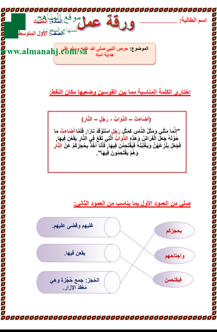 ورق عمل درس عناية الرسول صلى الله عليه وسلم بتعليم أمته مادة الحديث الصف الأول متوسط